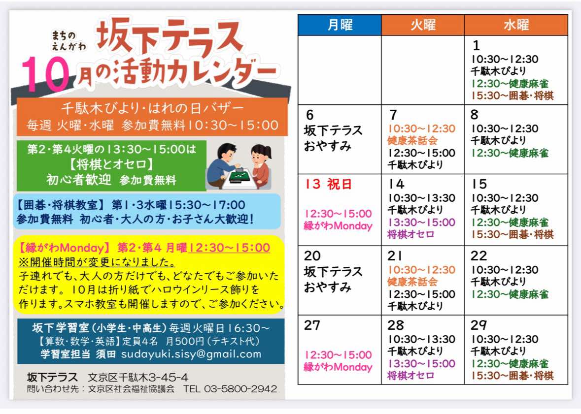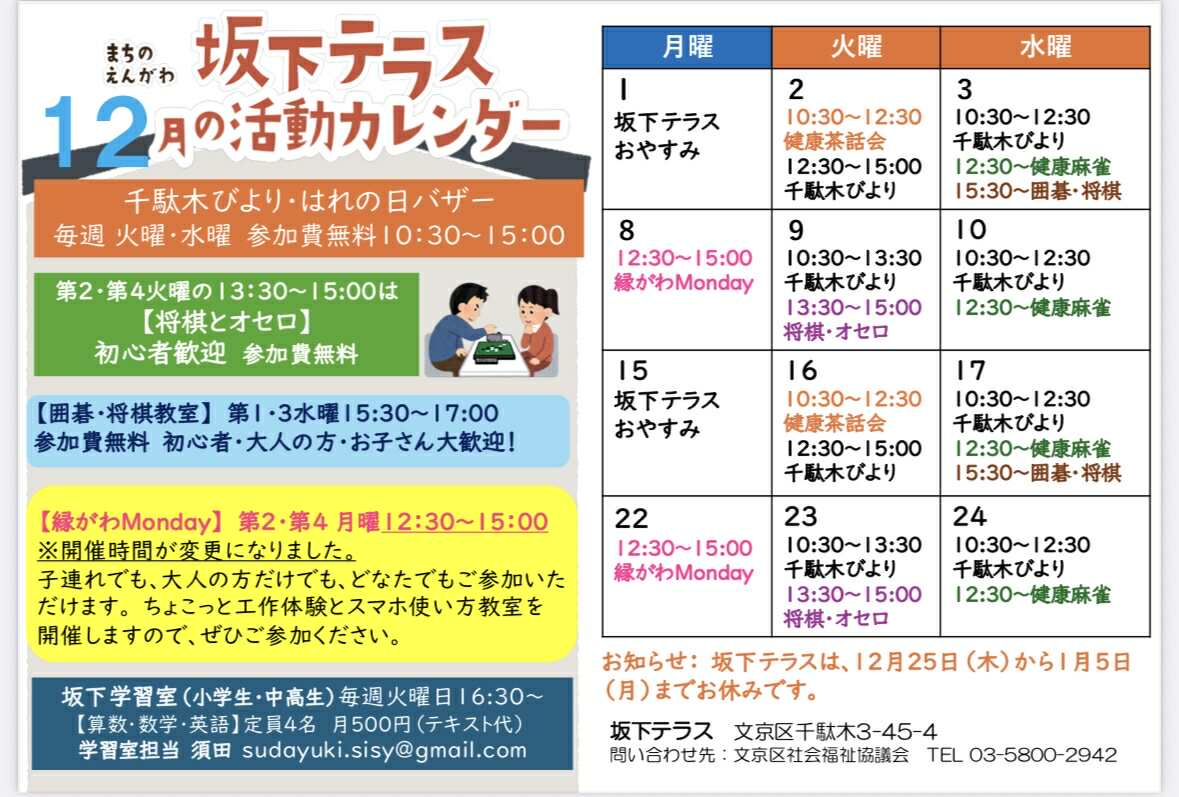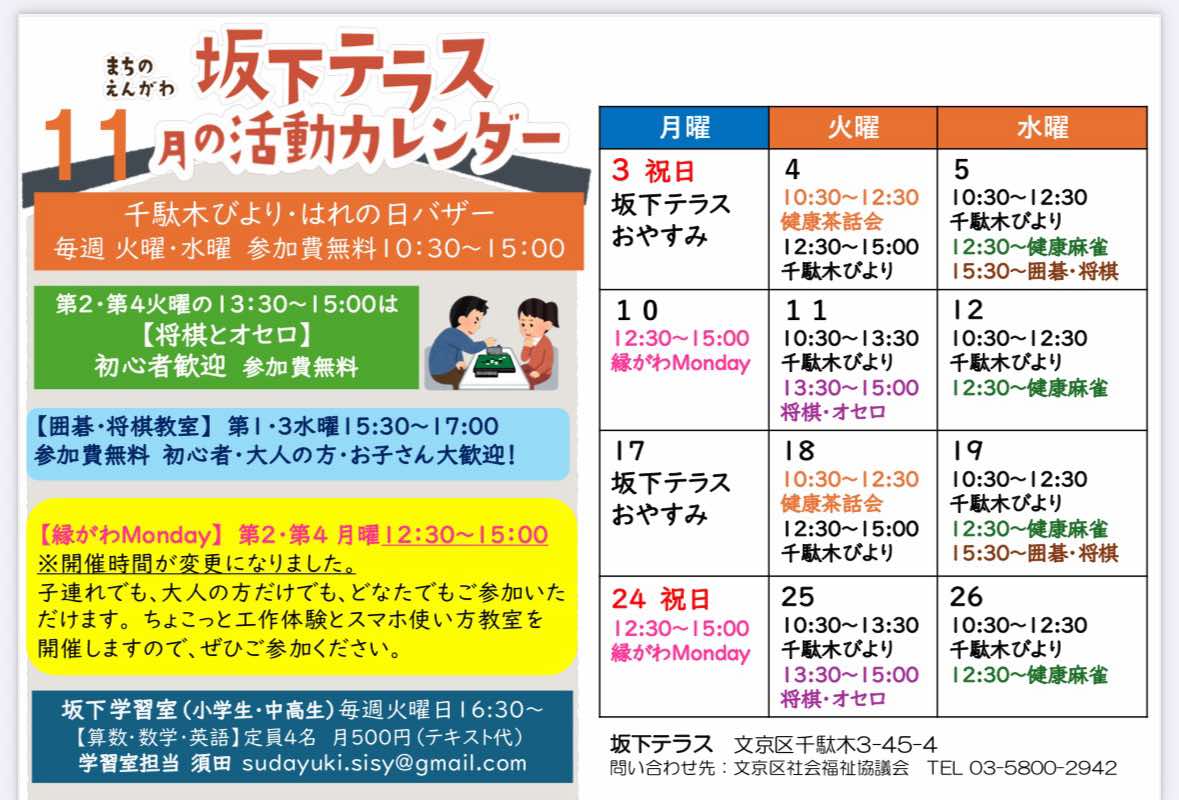 坂下テラスは、千駄木3丁目にある誰でも利用することのできる「まちの縁側」です。お散歩の途中の休憩や、日中の話し相手が欲しい方、地域で知り合いを作りたい方などお気軽にお越しください。