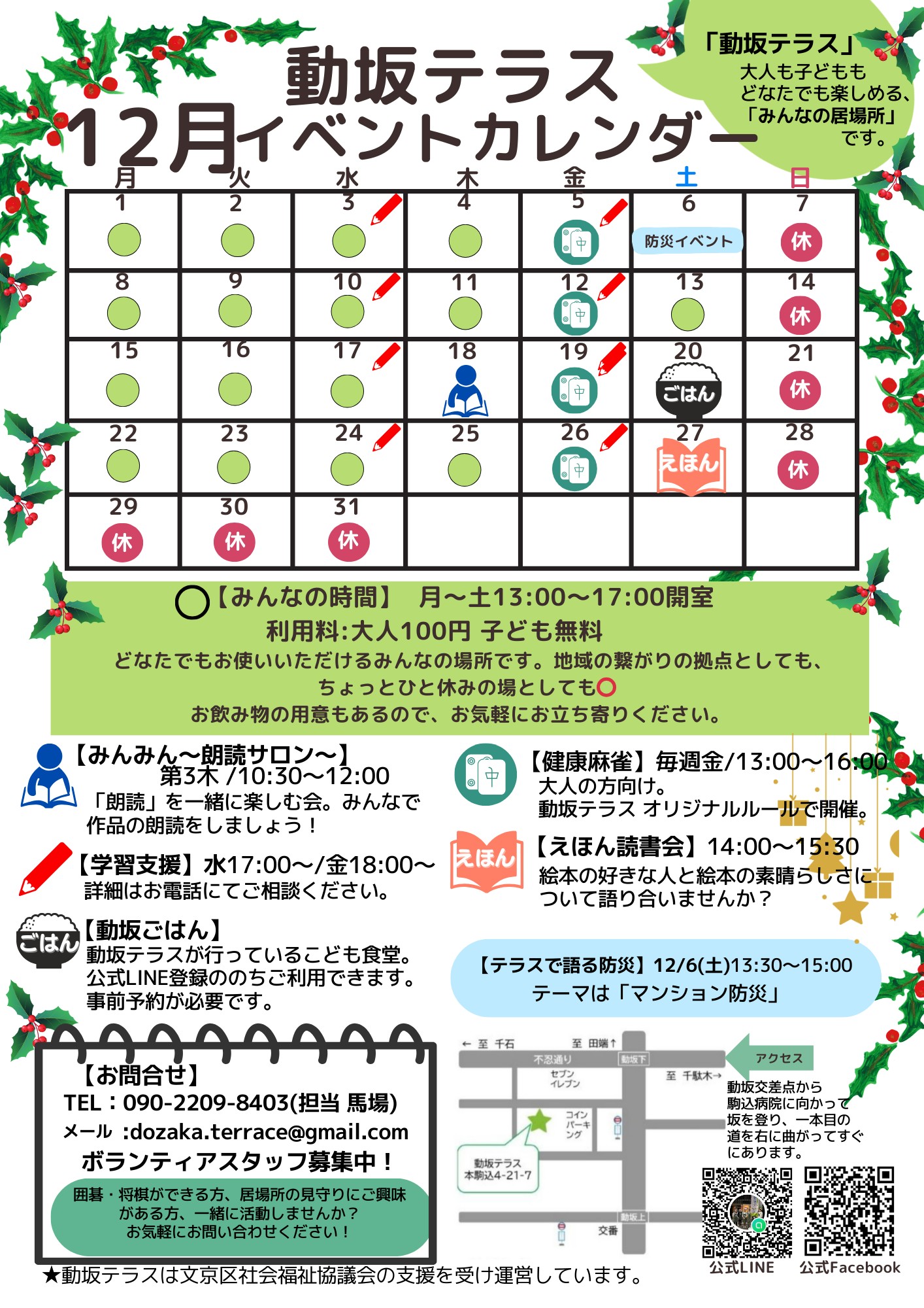 動坂テラスでは、一緒に活動してくださるボランティアを募集しています。来た方の話し相手になってくださる方、特技を生かしたい方など大歓迎です。