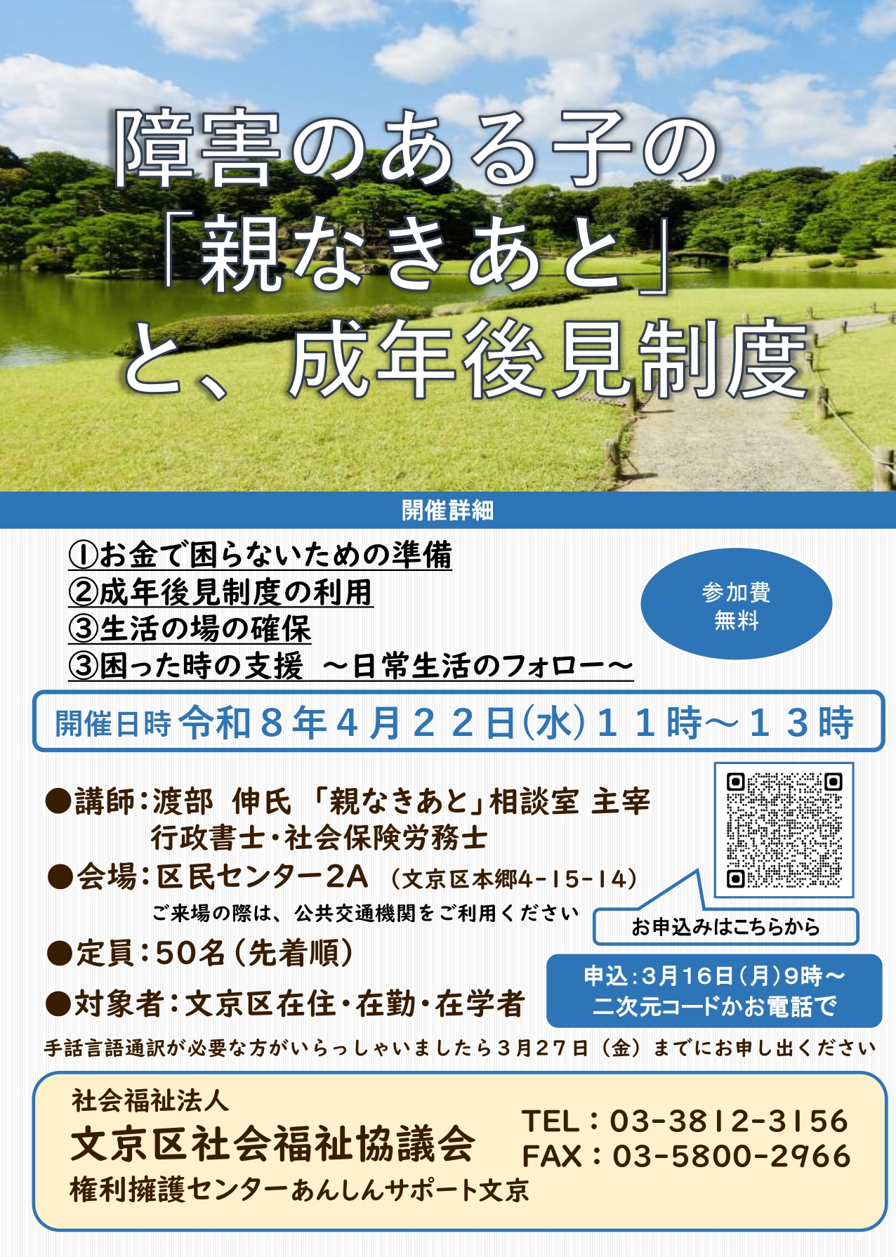 申込:令和8年3月16日(月)9時から開始 お電話(03-3812-3156)または↓